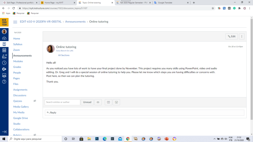 Starting in September 2020, my first job in Canada as Teaching Assistant of Multimedia Authoring program. It has been an amazing experience to review all the programs, become familiar with them, and improve my instructional technology knowledge. As we have synchronous learning, I assist both using the Canvas platform and Zoom, in-person and online. Teaching is the best way to learn, and it has been wonderful to learn with students’ questions. Part of my job is to engage students at the online learning platform through discussions, attending privately or in groups by Zoom and posting some tutorial videos about the main technology tools used in multimedia.